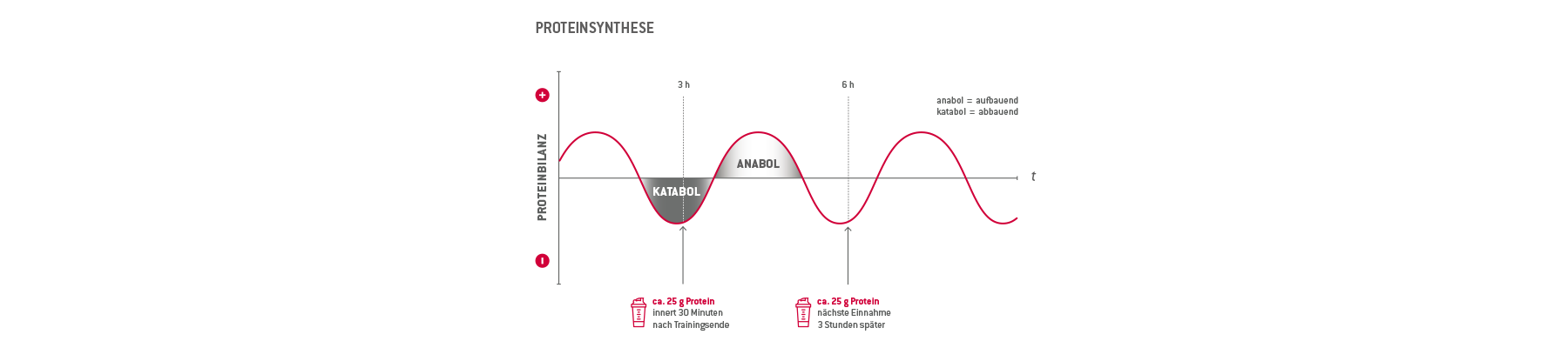 Katabole und anabole Phasen wechseln sich im Tagesverlauf ab. In der Regel bewegt man sich nach langen Nüchtern-Phasen, harten Trainings oder Wettkämpfen in einer katabolen Stoffwechselsituation. Mittels ausreichender Proteinzufuhr (mind. 25 g alle ca. 3 h) wird die Proteinbilanz und der Wechsel in eine anabole Situation begünstigt. Einnahme der Kohlenhydrate je nach Bedarf und individueller Zielsetzung.